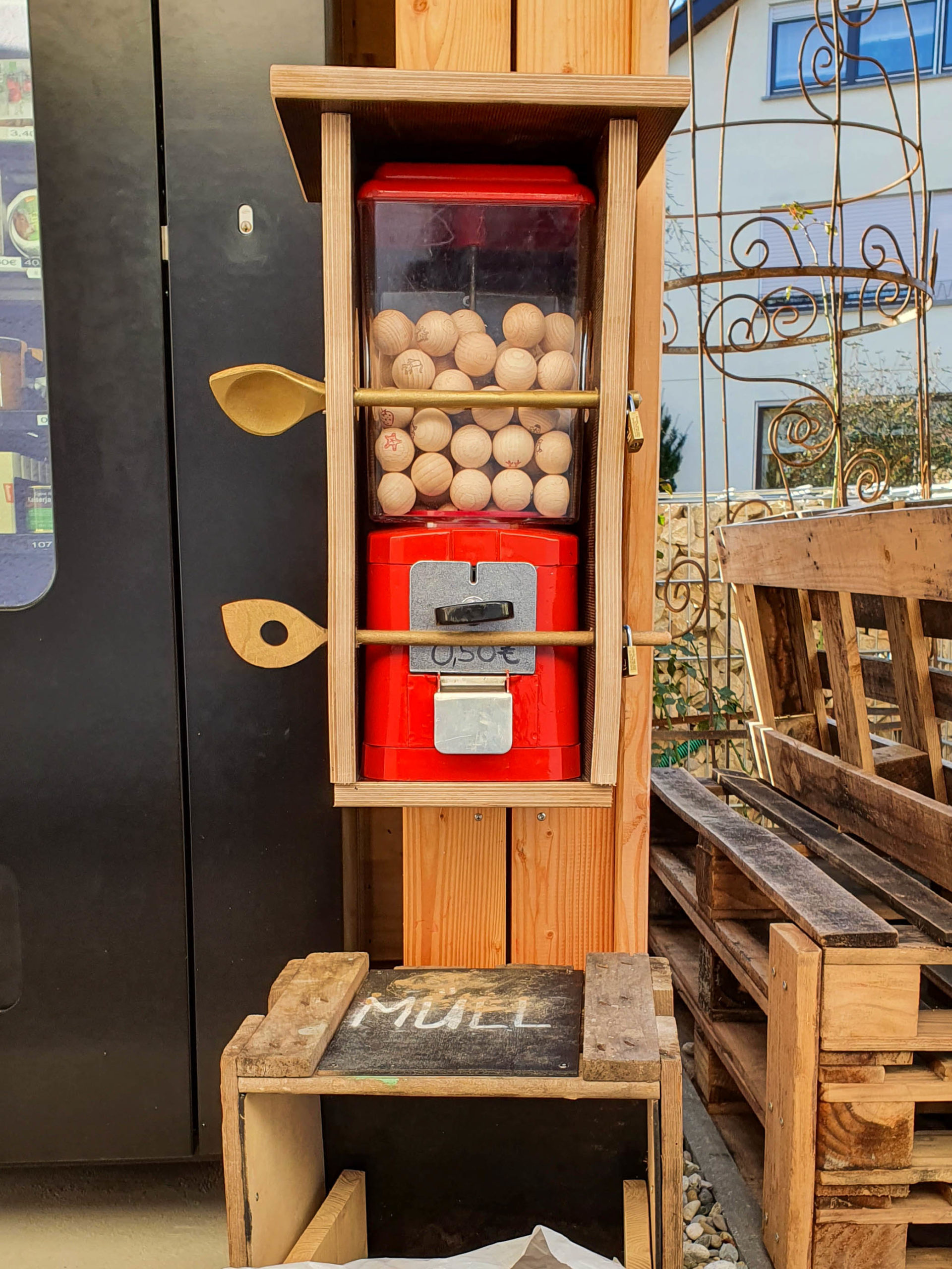 Als besonderes Highlight gibt es für die Kleinen eine selbstgebaute Kugelbahn. Eigens handwerklich gestaltete Holzkugeln können Sie hierfür an einem zweckentfremdeten Retro-Kaugummiautomaten für 50cent erwerben.